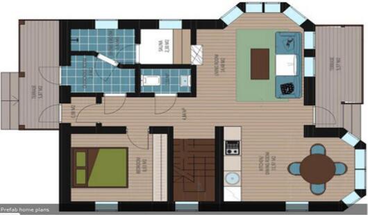 此款木屋設計為兩層樓,木房屋總面積100米²;一個外部車庫加住宅四室和廚房住宅。一樓的生活空間有53平方米,二樓47米²,車庫-